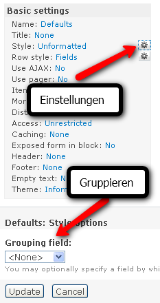 Es gibt bei den Einstellungen des Ausgabestils die Möglichkeit, ein Feld zur Gruppierung anzugeben.