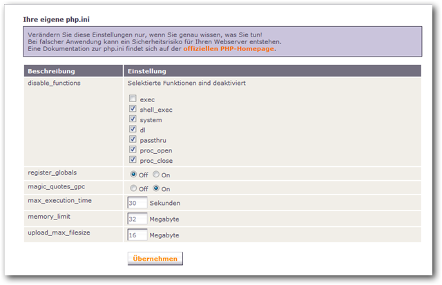 Einige grundlegenden Einstellungen können dann direkt auf der Eingabe maske gemacht werden. Allerding können beim memory_limit nur 2-stellige Eingaben gemacht werden.