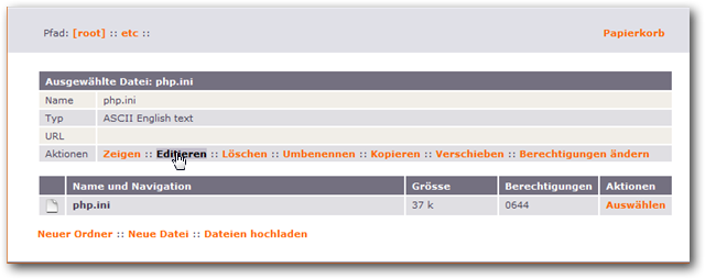 Die Datei wird dann unter Angabe der Tyteityps über der Dateiliste angezeigt. Dort wählt man in der Zeile Aktionen den Befehl Editieren.