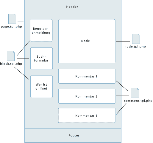 Ein Standard-Theme besteht u.a. aus den Dateien page.tpl.php, box.tpl.php, block.tpl.php, node.tpl.php und comment.tpl.php. Nachfolgende Abbildung zeigt den Aufbau eines Themes.
