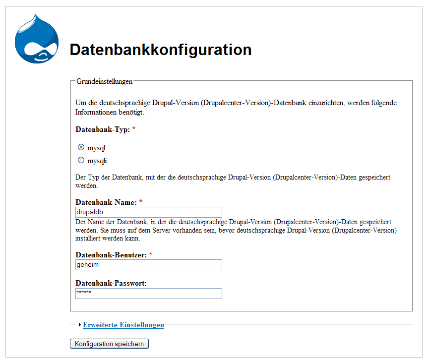 Im letzte Schritt teilt man Drupal die notwendigen Informationen zur Datenbank mit: