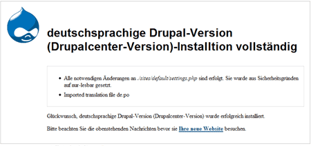 Diese Kurzanleitung beschreibt die Installation der "hier erhältlichen":http://www.drupalcenter.de/files/drupal-5.18-DE.tar.gz, deutschsprachigen Drupal-Variante. Der Installationsprozess unterscheidet sich nur geringfügig von der Installation des herkömmlichen Drupal-Paketes.