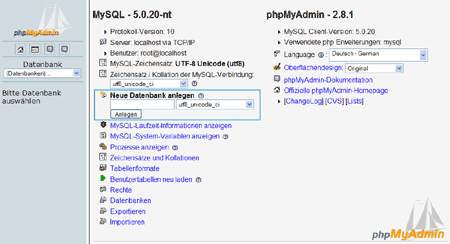 Falls noch keine Datenbank besteht, muß eine neue Datenbank angelegt werden. Auf herkömmlichen Webspace-Paketen steht dafür häufig das Tool PHPMyAdmin zu Verfügung.