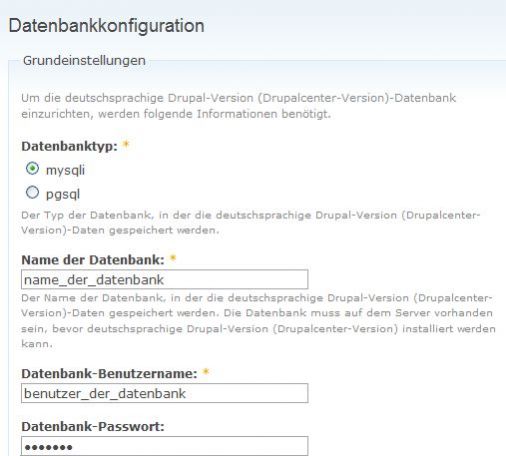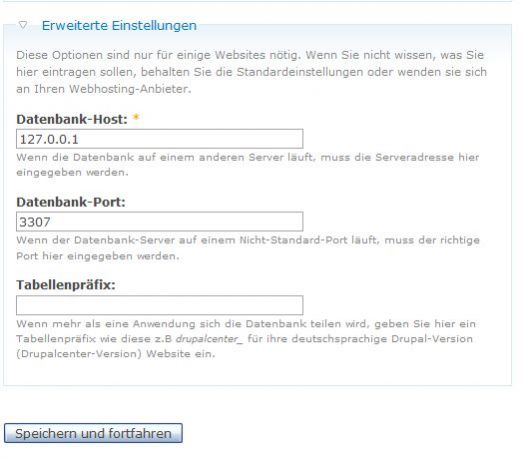 Hinweis: Das Feld Tabellenpräfix bedeutet, dass Drupal auch in einer bereits befüllten Datenbank installiert werden kann. Dadurch werden alle Tabellen, die durch Drupal angelegt werden, mit einem Präfix versehen. z.B. wird aus der Tabelle system -> meinpräfix_system.
