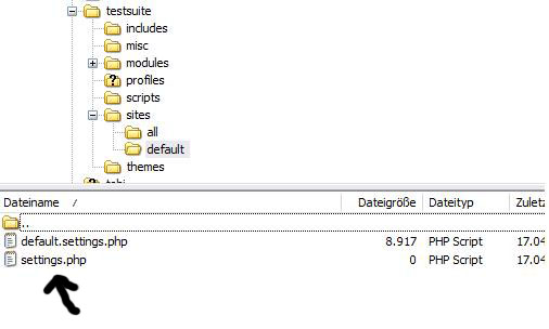 Erstelle jetzt ein leere Datei und benenne sie settings.php und schiebe sie in das Verzeichnis sites/default von Drupal.