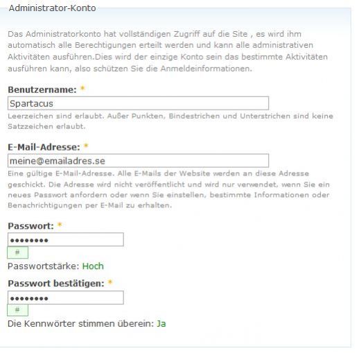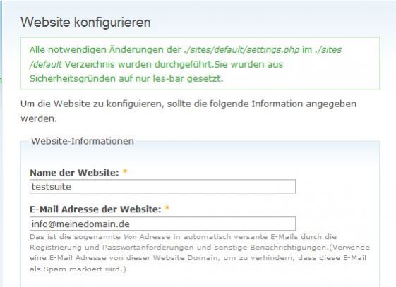 Im letzten Abschnitt werden allgemeine Information zur Website, dem Administrator-Konto sowie zu den Servereinstellung abgefragt bzw. ausgefüllt. Diese Angaben können auch später - falls nötig - im Verwaltungsbereich geändert werden.
