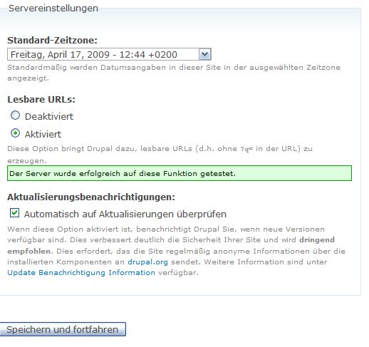 Bei der Option Aktualisierungsbenachrichtigungen wird das Kontrollkästchen automatisch von Drupal gesetzt, da durch Drupal das Modul Update Status aktiviert wird, um später über neuere Versionen von Drupal selbst, Zusatz-Modulen oder Themes in einem Bereich in der Verwaltung melden und anzeigen zu können. Klicke jetzt auf „Speichern und fortfahren“.