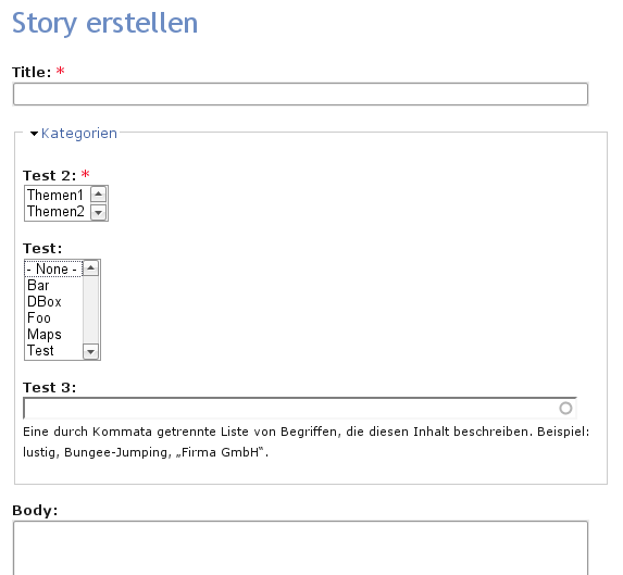 Ich habe das Besagte Vokabular (erster Post) und dem meinem Nodetyp zugeordnet, aber ich bekomme weder "Test" noch "Test2" angezeigt, allerdings das Freetagging Feld.