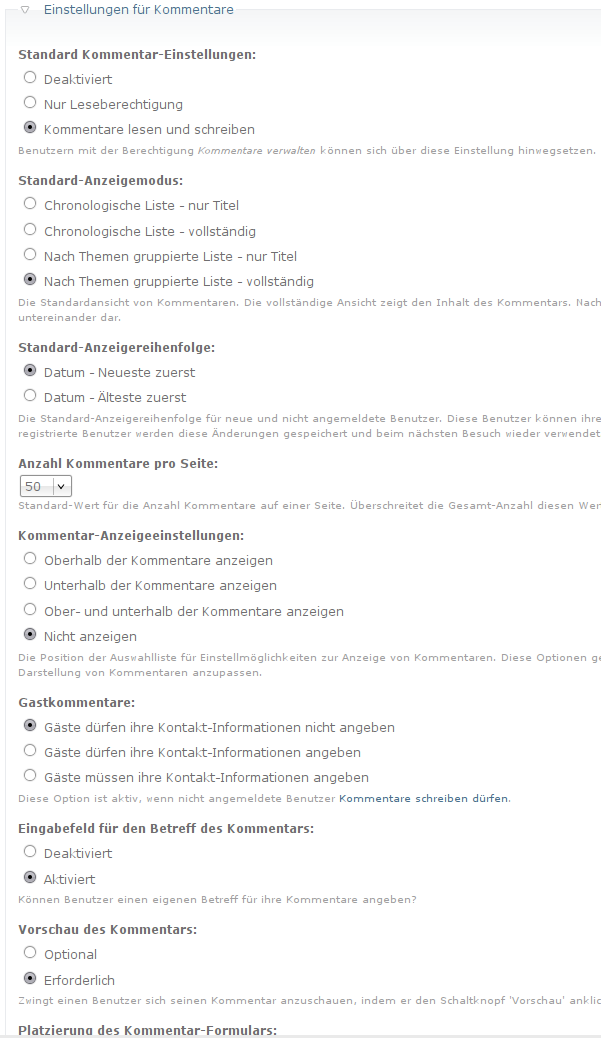 Bei Drupal 6 erfolgt das Einstellen der Kommentaroptionen bei den einzelnen Nodetypes.