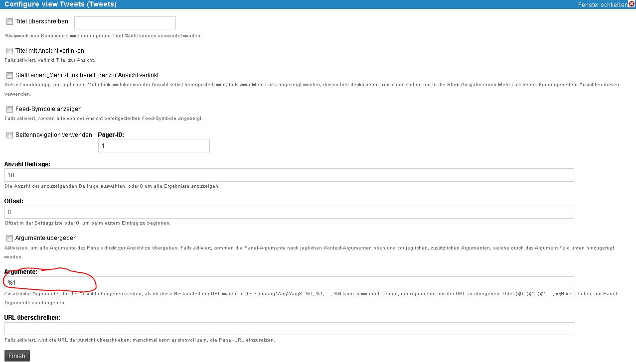 So viel zu den Gegebenheiten, funzt bis dahin alles prächtig. Nun zu Panels 3 und damit zum Problem: Ich habe mir ein Panel erstellt, in das ich die oben genannte Ansicht (View) laden möchte. Einfache Views ohne Argumente kann ich ohne Weiteres in das Panel laden und sie werden angezeigt. Nur wie zur Hölle funktioniert das bei Views mit Argumenten? Wenn ich die ins Panel lade, werden die nicht angezeigt. Hat jemand eine Idee, wie man hier vorgehen muss? Panels ist gelinde gesagt etwas unübersichtlich.