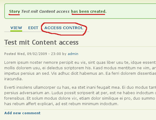 Sorry, muss mich korrigieren. Erst nachdem eine Node erstellt ist kann man Conntent acces an ihr administrieren: