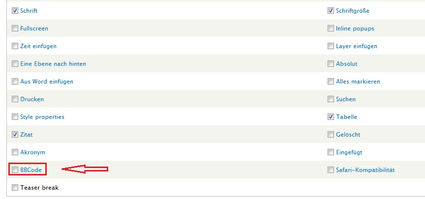Außerdem: Hast du beim TinyMCE bei den Button-Einstellungen einen Haken bei BBCode gesetzt (siehe Anhang)? Denn der Code sieht eher nach BBCode aus als nach HTML. Wenn dort ein Haken sein sollte, nimm den mal raus.