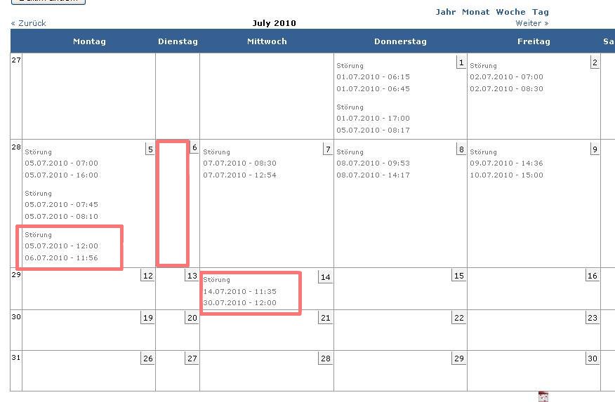.....AND ((DATE_FORMAT(ADDTIME(FROM_UNIXTIME(incidents.startdate), SEC_TO_TIME(7200)), '%Y-%m') <= '2010-07' AND DATE_FORMAT(ADDTIME(FROM_UNIXTIME(incidents.startdate), SEC_TO_TIME(7200)), '%Y-%m') >= '2010-07')).....Sollte aber so was stehen: startdate <= jetzt(2010-07) <= enddate oder so: startdate <= jetzt AND enddate >= jetzt
