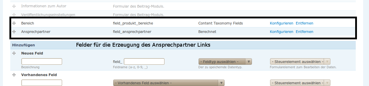 In diesem habe ich auch verschiedene Felder definiert. Und ab hier habe ich das Problem. Wie kann hier bitte ein Feld erzeugen das auf die Bereiche referenziert? Auf die Ansprechpartner gehts ja.
