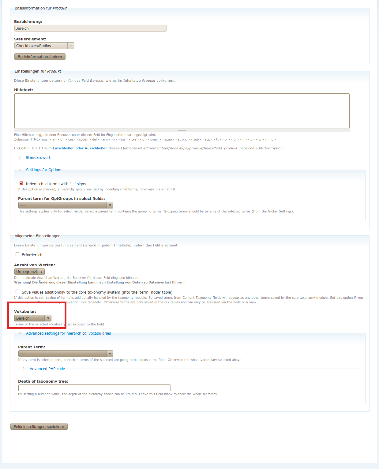 Lege ein neues Vokabular an und ordne diesem die Begriffe für die einzelnen Bereiche zu. Außerdem fügst du dieses Vokabular bei den beiden genannten Inhaltstypen ein.