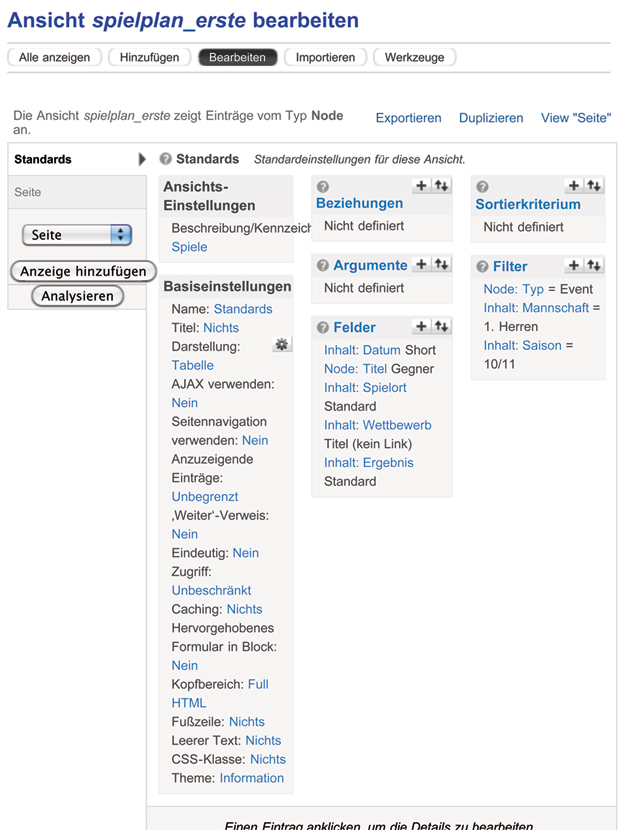 Gefiltert werden in der View (hier heißt sie bspw. spielplan_erste) der Nodetyp (Event), Inhalt (Mannschaft - in diesem Fall: 1. Herren), und Inhalt (Saison - 10/11 - so wird das im angelegten Event halt auch eingetragen).