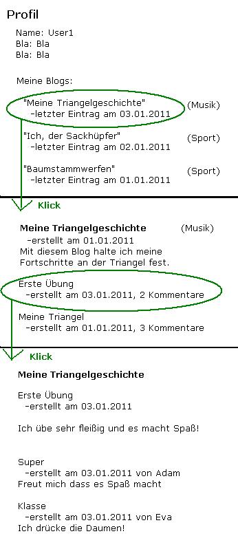 Es gibt zwei Kategorien, Musik und Sport. Jetzt schreibe ich einen Blog über Triangeln (Blog1 ind Kategorie Musik). Zeitgleich schreibe ich einen Blog über Sackhüpfen (Blog1 Kategorie Sport). Zwei Wochen später merke ich aber, dass ich nicht nur gerne sackhüpfe, sondern auch Spaß am Baumstammwerfen habe und entschließe mich dazu, einen Blog hierüber zu schreiben (Blog2 Kategorie Sport).