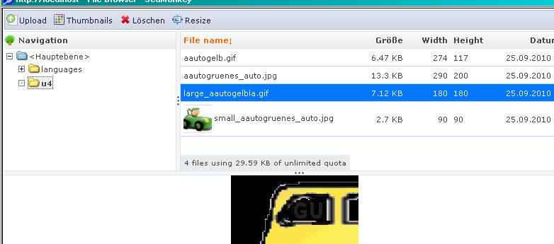 Buttons gibts: Upload, Thumbs, Löschen, Resize.