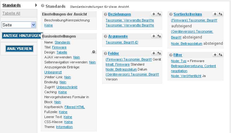 Nun aber klappte die Anzeige nicht, weil das 2x hinzugefügte Feld Taxonomie:Begriff in beiden Spalten das selbe anzeigte (früher einmal:Gerät, da gings / nun 2x Gerät + Version). Also vermutete ich dass eine Beziehung zum 2. Vokabular hergestellt werden muss.