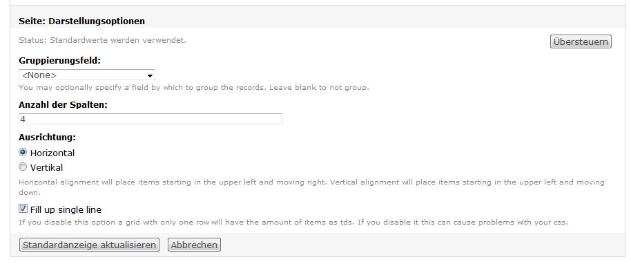 verrat uns doch bitte noch die Darstellungsoptionen der Raster-Einstellung oder auch ein Bildchen davon. Hast Du dort Vertikal oder Horizontal aus Ausrichtung gewählt? Wenn Du nämlich 10 Spalten bei 10 Ergebnissen eingestellt hast, werden die Daten bei horizontaler Ausrichtung natürlich zu erst nebeneinander dargestellt.