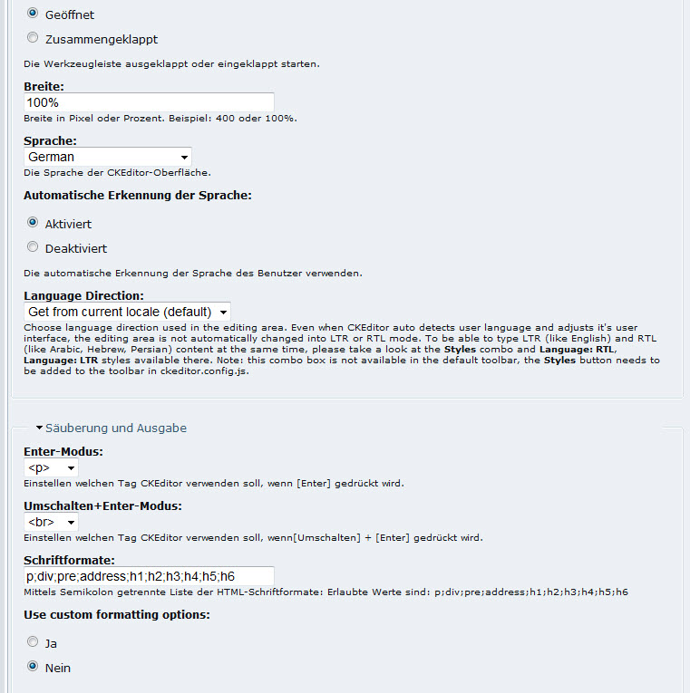 hast Du in den Einstellungen vom ckeditor etwas gemacht? Zu finden unter dem Menüpunkt "Einstellungen" -> ckeditor.