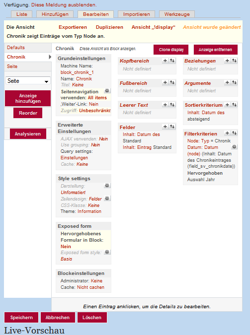 Wenn ich nun versuche in einer View nach Inhaltstyp Chronik zu filtern und die Felder Beitragsdatum und Beitrag ausgeben will, gibt mir der View nur das erste Beitragsdatum und dann alle Beiträge (Typ Text) aus.