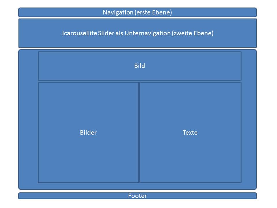 Nun bin ich zur 2. Seite übergegangen. Hier möchte ich ja fast diesselbe Optik wie auf der Frontpage nur dass zwischen der Navigation und dem Hauptcontentbereich ein Slider sitzt. Dieser soll die zweite Navigationsebene darstellen. Hierfür würde der Slider ja auf jeder Folgeseite anders befüllt werden. Hat jemand einen Tipp wie ich den Slider immer dynamisch befüllen kann?