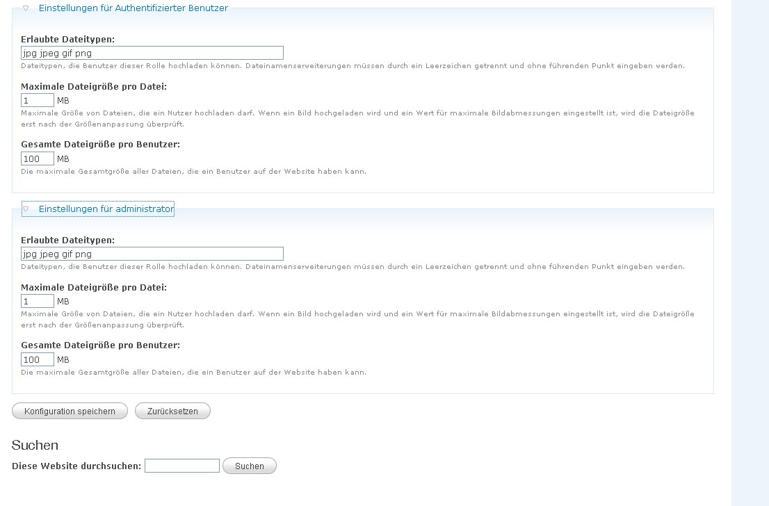 Hast du auch unter admin/settings/uploads geschaut, ob die Werte dort nicht zu niedrig sind (z. B. beim Punkt "Standardmäßige gesamte Dateigröße pro Benutzer:") ?