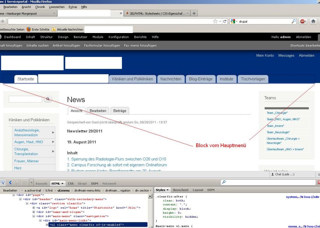 Nachtrag: Drupal vergibt schon automatisch die verschiedenen DIV-Container. Diese kannst Du einfach im html-Text finden.