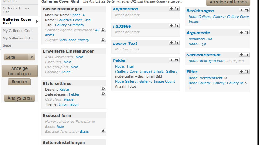 geht es nicht. Der einzige Unterschied ist, daß die Gallerienübersicht in der ersten Seite in einem Block angezeigt wird, bei der zweiten in dem von dem Modul Node Gallery eingebettetem View unter URL/galleries. Die Views Einstellungen sind wie ich es sehe, vor allem von dem fraglichen Feld die selben.