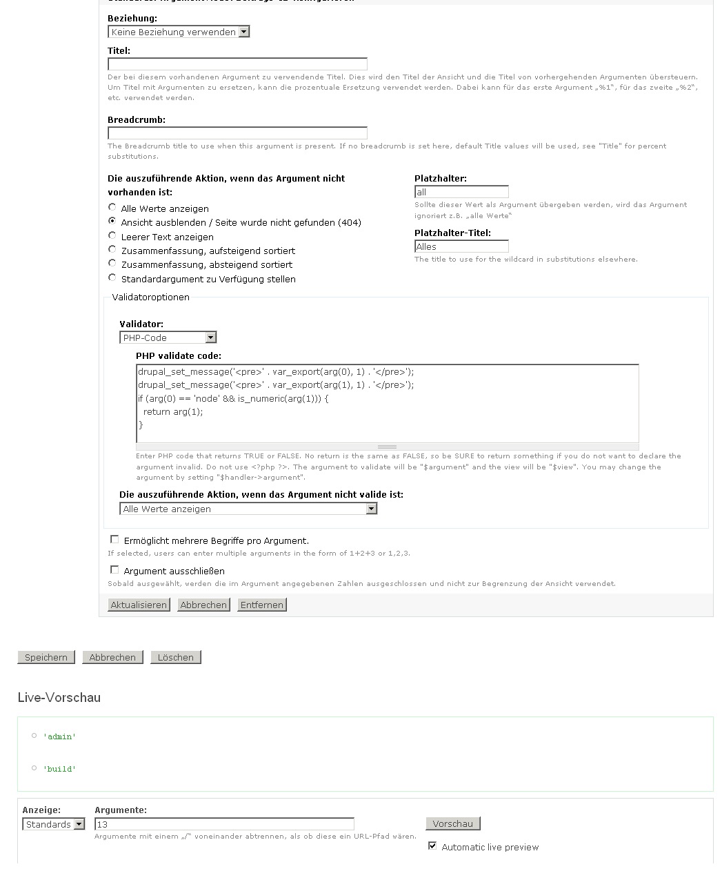 Ich pack mal nen Screenshot meiner aktuellen Argumente Einstellung anbei ... wahrscheinlich habe ich da eh schon nen Fehler drin, sowie ich mich kenne? Den Code habe ich mal mit eingefügt, aber da erhalte ich nur zwei grün gehaltene "admin" und "build" über der Vorschau?