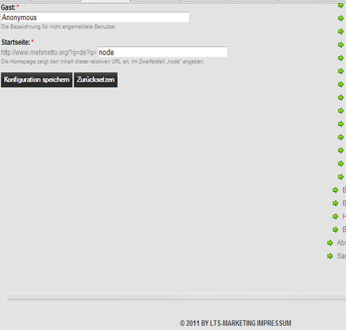 Hier kannst du den Pfad für deine Drupal-Startseite hinterlegen. Dieser Pfad / Seite muss natürlich im System vorhanden sein.