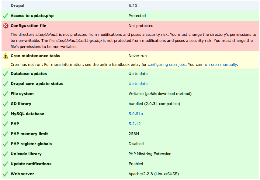 Ok, also im Anhang mal ein "Bildschirmfoto" vom "Status Report" der gerade installierten Drupal 6.20 Variante