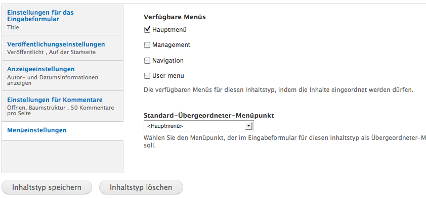 Der Node ist im Menu "angehakt" weil er ja schon im Menu ist!!! Wenn Du die Markierung entfernst, dann ist er nicht mehr im Menu! Ganz einfach eigentlich ... Das einzig unglückliche ist "erstellen" in der Beschreibung. Wenn Dich das zu sehr verwirrt, dann kannst du ne andere Bezeichnung über die Oberflächenübersetzung vergeben.