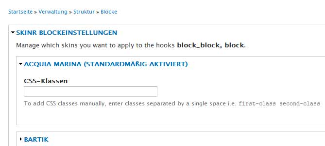 Also mal admin/build/block aufrufen und beim entsprechenden Block auf "Konfigurieren" klicken. Dann dürftest du die Gruppe "Skinr Blockeinstellungen" finden und darin Untergruppen für die jeweiligen Themes. Dort wählst du dein Theme aus und kannst entsprechende Einstellungen tätigen.