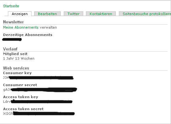 Allerdings als ich nun die neuen Consumer Keys und Consumer Secret eingegeben ins Twitter Modul, und dachte ich es wird auch automatisch unter "Web Services" aktualisiert, welches man ja unter ../user/1/ sieht.