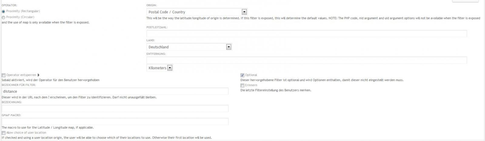 Ich möchte in der Ausgabe die Entfernung zur eingegebenen PLZ anzeigen lassen. Dafür ist das Feld "Distance" vorgesehen. Aber leider bleibt dieses immer leer. Außer wenn ich dem Feld in der Konfiguration eine feste PLZ zuweise. Das Problem ist anscheinend, dass dieses Feld keine Verbindung zu der im Filter abgefragten PLZ herstellt.