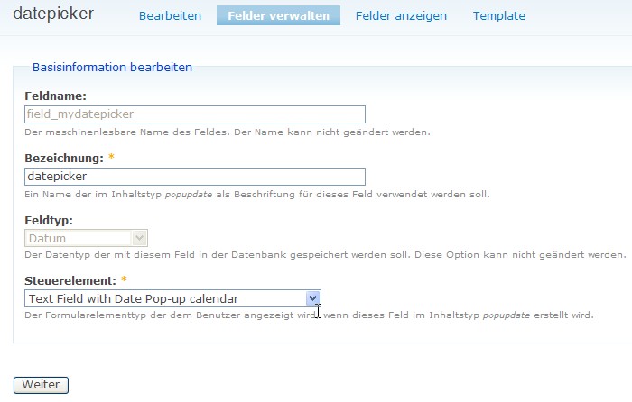 Nach der Installation von Date und jQueryUI (Anleitung in der beiliegenden README.txt) kannst Du einem Inhaltstypen einfach ein Datums-Feld Popup hinzufügen.