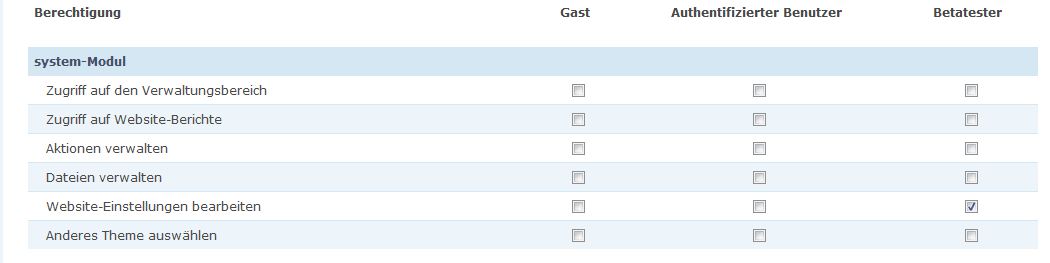 Danke für die schnelle Hilfe. Das hat mich auf die Idee gebracht eine neue Rolle "Tester" einzurichten und diese mit der Berechtigung für "System verwalten" auszustatten. Fuktionieren tut es, das Problem ist, dass mein Tester jetzt viel zu viel sieht. Er hat ja in der Systemverwaltung normalerweise "gar nichts zu suchen".