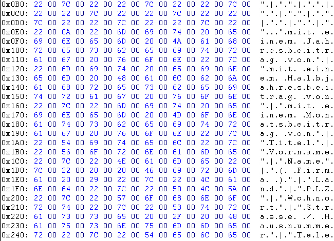 Kannst du uns denn hier einmal einen Beispieldatensatz zur Verfügung stellen ? Ich betrachte mir die Ergebnisse von Webforms normalerweise nicht in einem Hex-Editor sondern verwende hier die von mir angesprochenen Texteditoren bzw. zur weiteren Verarbeitung OpenOffice bzw. Libreoffice..