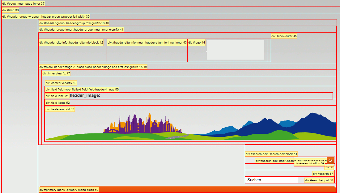 bild-abmessungen: 960x90 px. die spitzen der stadtkulisse sollten nur wenige pixel abstand zum seitenkopf haben und unten sollte das bild auf der orangenen navi-leiste aufsitzen. es scheint, als ob das (ausgeblendete) logo und suchfeld einfach nicht drübergelegt werden. das webdeveloper-plugin zeigt erwartungsgemäß drei divs, die übereinander/nebeneinander liegen.
