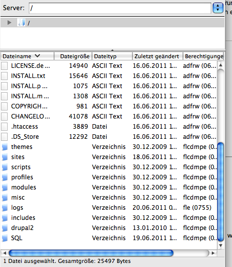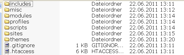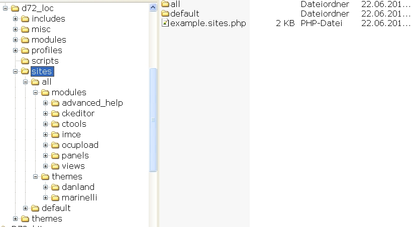 Das, was Du selbst hinzufügst, liegt unter sites/all, damit sind der Core und Deine spezifischen Änderungen und Ergänzungen strikt getrennt, und Du brauchst immer nur den Ordner /sites zu sichern, um immer alles auf dem aktuellen Stand zu haben, und die DB natürlich. Siehe Anhang Struktur2.jpg. db7_loc ist mein Drupalverzeichnis, wie man das nennt, ist egal.