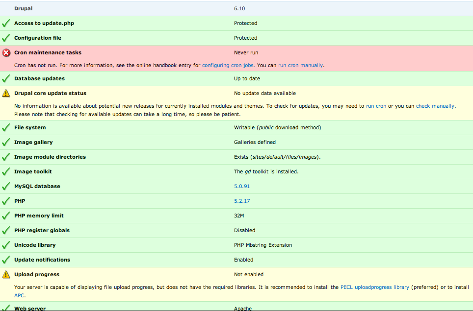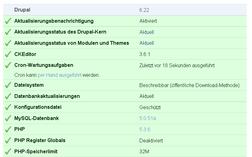 Im Status report steht jetzt Drupal 6.22. Und alles ok, außer Datenbank.