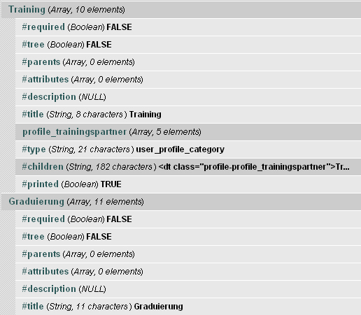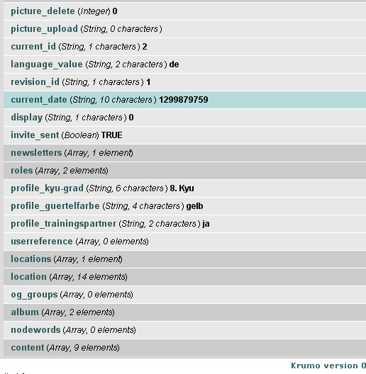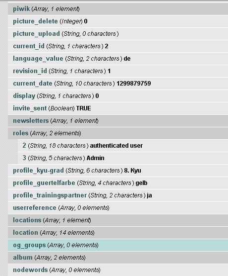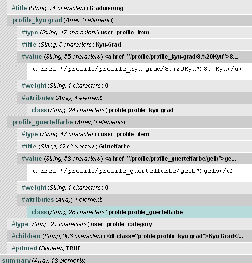 $accountein Array ist und der Wert mit<?php print $account['profile_kyu-grad'] ?>abgefragt werden muss...Hallo, so, nochmal mit devel