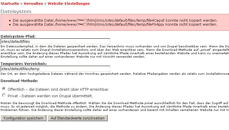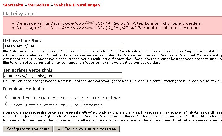 ich muss jetzt jedoch zugeben, dass ich gar net mehr weiß, wo ich das gemacht hatte. kannst du mir bitte noch einmal hilfestellung geben, wo ich das Temp-Verzeichnis bei Drupal eingebe? Und ja, das Verzeichnis ist auf Rechte 777 gesetzt.