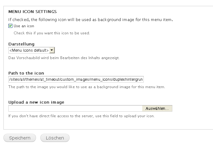 versuche gerade den Einsatz von Menu Icon. Es wird ordnungsgemäß beim editieren eines Links zu einem Menüpunkt unter Struktur --> Menü angezeigt. Ich gebe dort den Pfad ein, z.B. /sites/all/themes/at_timeout/custom_images/menu_icons/duplexhintergrundbild_V1.jpg Alle Subordner sind auch angelegt.