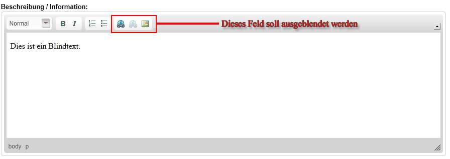 Und zwar: Ich habe den CKEditor installiert und konfiguriert. Nun habe ich bereits den Funktionsumfang auf Basic gestellt, jedoch wird weiterhin die Möglichkeit des Hyperlinks und des Bilduploads eingeblendet. Diese möchte ich gern bzw. muss ich ausblenden. Nun wollte Ich fragen, welche Möglichkeiten ich dafür habe.