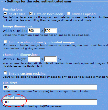 Limits: Dateigröße = 500 KB, Dimensions = 500x500, Quota = 499.57 KB/500 KB