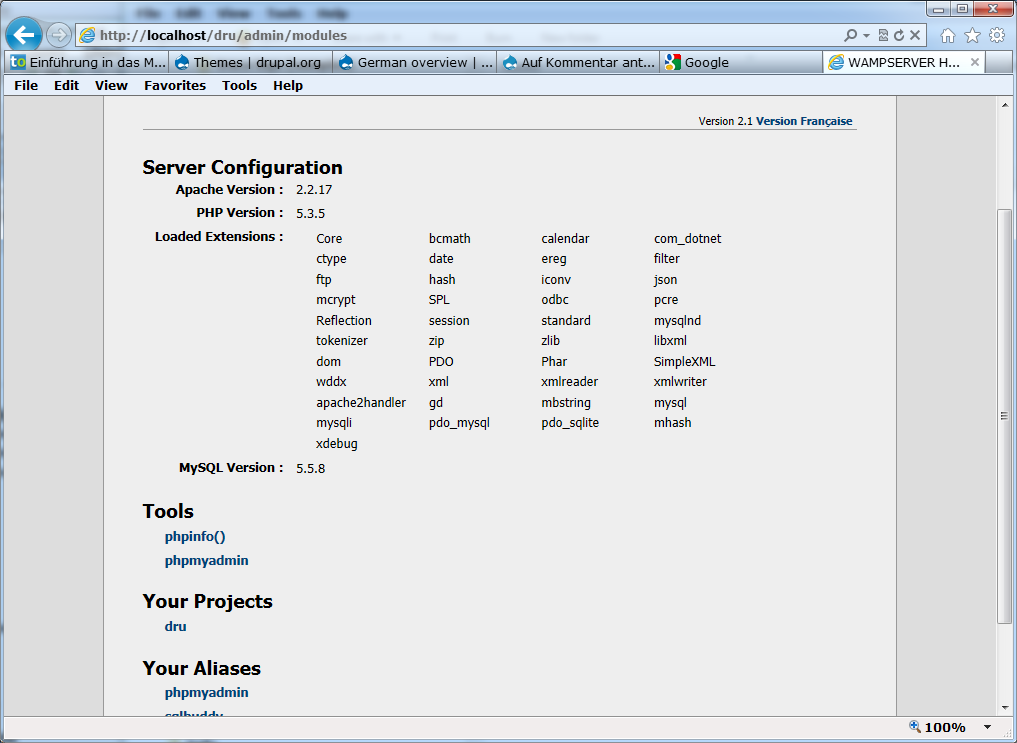 Möglicherweise bist Du ja auch ausgelogged und musst Dich erst als Admin einloggen? Wäre denn http://localhost/dru/user oder http://localhost/dru?q=user und danach gehts dann auf die Modulseite mit den erwähnten URLs