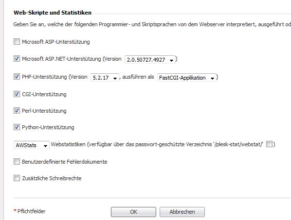 Im Plesk hab ich wirklich schon alles durchforstet, da ist nix bis auf einem Setting unter der Domain wegen CGI/FastCGI/ISAPI. Da hab ich auch schon alle 3 probiert, ohne Erfolg. Welche PHP Settings meinst du?